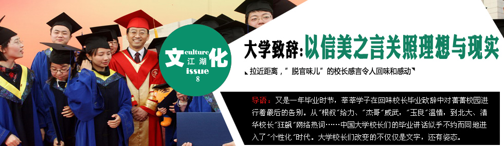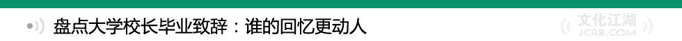 “我們一起在BBS‘冒泡’‘灌水’,一起看《交大那些事》,一同撥過‘餓了么’的外賣電話……”——被稱為“杰哥”的上海交通大學校長張杰 “很可能復(fù)旦給你們的這些貌似無用的東西,恰恰是最神圣、最珍貴的精神價值。它將滿足人心靈的需要,它將注入你們在座每一位的終生!薄獜(fù)旦大學校長楊玉良 人間正道是滄桑,在2052年百年校慶之日,怎樣的文字將鐫刻其上?你們和我們,是麻木?還是吶喊?是沉淪?還是奮起?——中國政法大學2011屆研究生畢業(yè)致辭 “多年以后,你們來,或者不來,母校就在這里,不舍不棄;見、或者不見,我們的心永在一起,不分不離! ——廣外校長仲偉合 “那就把幾句清涼的話語,說給燥熱的你:你可能繼續(xù)學習,但當清楚這到底是手段,還是目的。一個人應(yīng)當快學習,但不應(yīng)該學習學習再學習,最后聰明地死去! ——成都理工大學文法學院院長陳俊明2011屆畢業(yè)致辭《業(yè),畢了沒?》 “你們必須用你們過人的智慧和思辨的精神去提升政治決策的水平。你們必須以公民的身份響應(yīng)時代的號召”!斝iL理查德·查·萊文在2010年畢業(yè)致辭《重塑政治》