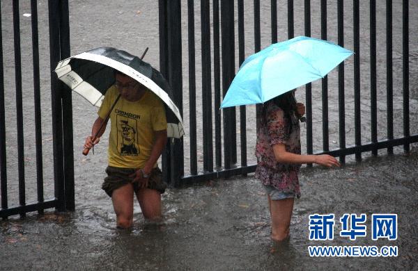 7月3日,兩名市民在成都市武侯區(qū)長壽南路涉水前行。當日,四川省成都市遭暴雨襲擊,多處路段積水嚴重,給市民出行帶來不便。據(jù)四川省氣象臺發(fā)布的信息,成都市3日傍晚到4日晚間仍有明顯的降雨天氣過程。新華社發(fā)(薛玉斌 攝)