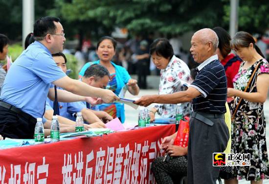 正義網(wǎng)九江6月24日電(通訊員 劉興鹿 賴青青)“我的棉花地征地款至今還沒有到位,這事你們檢察院管不?”“大媽,您先說說具體情況,該我們管的我們肯定管!”6月23日上午,江西湖口縣檢察院在該縣鄱陽湖大市場正式啟動全國檢察機關(guān)第十七個“舉報宣傳周”活動,該院領(lǐng)導以及經(jīng)抽調(diào)出來的全院20余名各科室骨干參加本次活動。舉報宣傳活動吸引了大量群眾駐足而觀,活動開始不久,就有群眾上前咨詢。