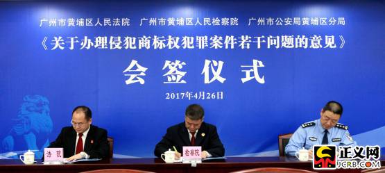 正義網(wǎng)廣州4月26日電(記者鐘亞雅 通訊員周園)今日是世界知識產(chǎn)權(quán)日,(2017年4月26日)上午,廣州市黃埔區(qū)人民法院、廣州市黃埔區(qū)人民檢察院、廣州市公安局黃埔區(qū)分局《關(guān)于辦理侵犯商標權(quán)犯罪案件若干問題的意見》(以下簡稱《意見》)聯(lián)簽儀式在廣州市黃埔區(qū)人民檢察院舉行。該意見將在三單位聯(lián)簽后正式印發(fā),并指導一線公檢法辦案干警的實際工作。