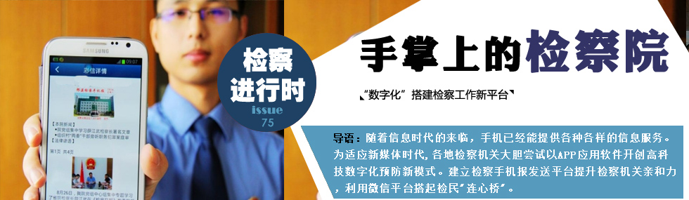 該院積極引入科技信息化手段,投資引入了移動彩信資訊平臺,通過相關(guān)審核建立起陽光檢務(wù)手機報的發(fā)送平臺,采取定期推送和?扑偷姆绞,向人大代表、政協(xié)委員、人民監(jiān)督員和群眾代表發(fā)送檢察動態(tài)、法律小貼士、案例速遞、雉水檢愛、代表之窗等內(nèi)容,分主題介紹檢察機關(guān)主要職能及工作特色亮點。同時,積極傾聽社會各界意見建議,對收到的50余條意見建議,均落實專人進行整理、跟進和反饋,通過互動真正發(fā)揮了手機報的聯(lián)絡(luò)傳遞作用。[詳細(xì)]