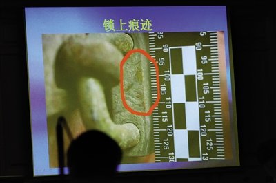 石柏魁用故宮內(nèi)的一根鐵棍,前往誠(chéng)肅殿門(mén)口撬鎖,但多次努力未果后放棄,現(xiàn)場(chǎng)留下撬鎖的痕跡。