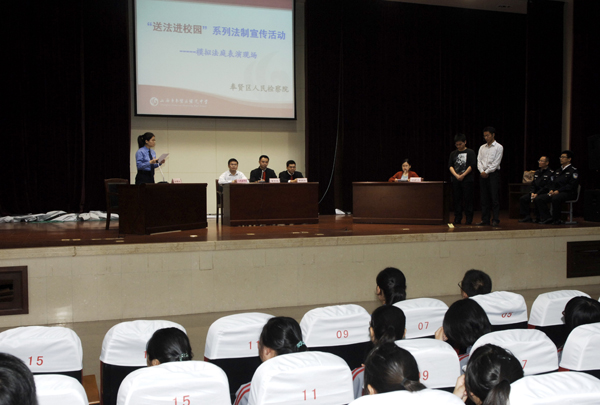 為迎接黨的十八大召開,加強社會主義法治理念教育活動,奉賢區(qū)檢察院開展模擬法庭進校園活動。該院未檢科選擇今年審理的一起以高利貸形式詐騙在校學(xué)生錢財?shù)牡湫桶讣?通過青年干警形象逼真地模擬小品表演,再現(xiàn)詐騙犯罪情景,隨后開設(shè)模擬法庭進行開庭審理,作以案論法的法制教育。庭審結(jié)束后,圍繞這起典型案例所暴露出的社會問題,檢察官與學(xué)生進行交流互動,作法律法規(guī)知識的現(xiàn)場問答,提高學(xué)生們的法律常識。模擬法庭進校園活動現(xiàn)場氣氛熱烈,法制宣傳效果好,檢察干警的精彩表演,受到了師生們的一致好評!