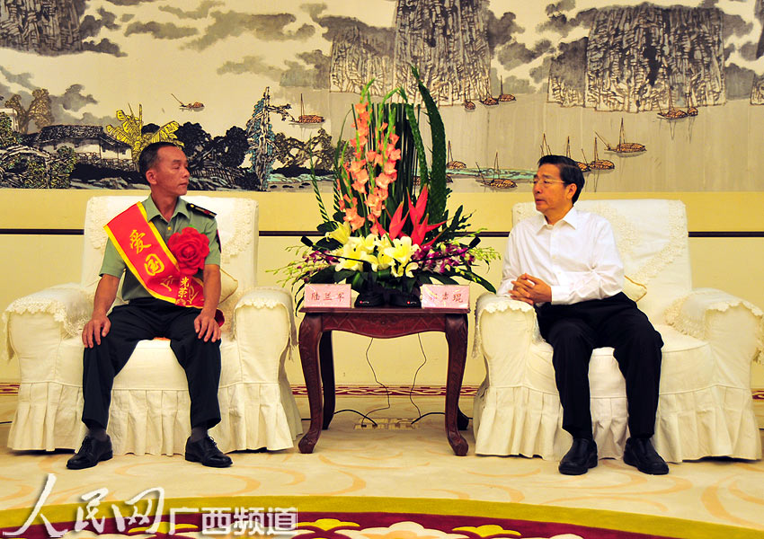 大會(huì)上,自治區(qū)黨委書記、自治區(qū)人大常委會(huì)主任郭聲琨,廣州軍區(qū)副司令員王治民中將作了重要講話,充分肯定了陸蘭軍堅(jiān)守邊疆的愛國奉獻(xiàn)精神,號(hào)召全區(qū)黨員干部群眾以陸蘭軍為榜樣,堅(jiān)定信念愛國奉獻(xiàn)、立足本職創(chuàng)先爭(zhēng)優(yōu),為加快實(shí)現(xiàn)富民強(qiáng)桂新跨越而努力奮斗。自治區(qū)主席馬飚同志宣讀《廣西壯族自治區(qū)人民政府 廣西軍區(qū)關(guān)于授予陸蘭軍同志“愛國戍邊楷!狈Q號(hào)的命令》。之后馬飚與廣西軍區(qū)司令員龍義和給陸蘭軍頒發(fā)了證書和獎(jiǎng)牌。