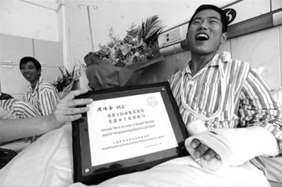 昨天,在解放軍411醫(yī)院內(nèi)科大樓11樓的手外科病房26號病床上,周傳金領(lǐng)到了上海市見義勇為評審委員會為他頒發(fā)的“上海市見義勇為先進(jìn)分子”證書。昨天傍晚,周母從安徽趕到上?赐麅鹤印P≈芩诘墓疽财钙錇榻K身員工。