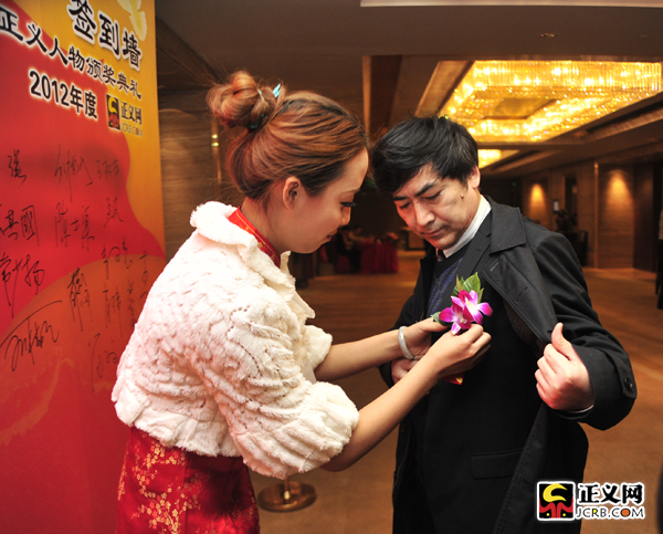 禮儀人員為到場(chǎng)嘉賓佩戴胸花