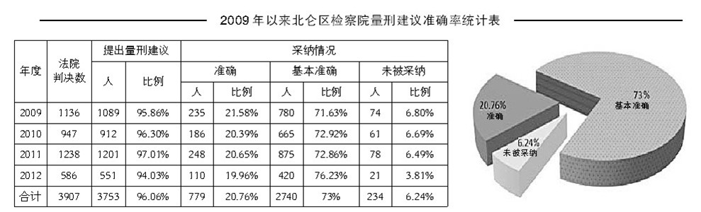 據(jù)統(tǒng)計(jì),2009年至今,該院提起公訴3907人,提出量刑建議3753人,量刑建議比率達(dá)到96.06%。其中,建議與判決完全一致的占20.76%,建議基本準(zhǔn)確(三年以下案件相差半年以內(nèi),三年以上案件相差一年以內(nèi))的占73%。