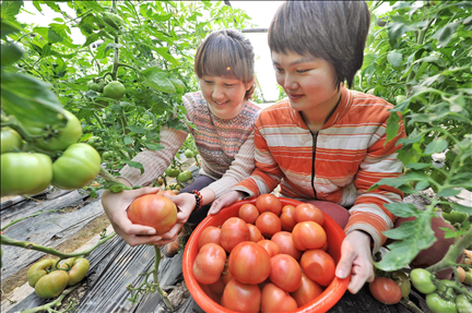 溫室大棚內(nèi)。瞧,我摘的西紅柿。