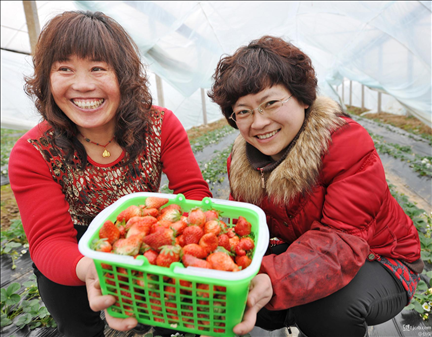 溫室大棚內(nèi),兩姐妹采草莓趕年集