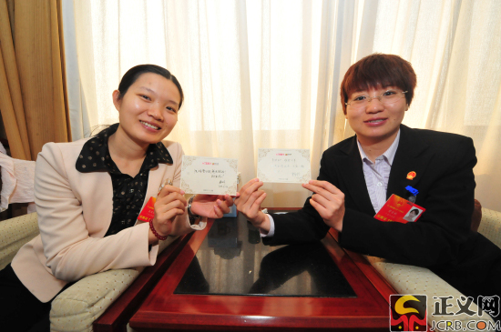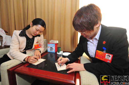 兩位代表在《檢察日?qǐng)?bào)》、正義網(wǎng)制作的兩會(huì)明信片上寫下自己對(duì)公平正義的理解。正義網(wǎng)記者程丁 攝