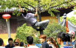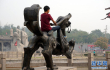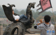 10月1日,在河南省焦作市影視城,一名游客騎在景觀雕塑上拍照留影。當(dāng)日是國慶長假第一天,一些游人在旅游景點隨意攀爬、亂刻亂畫、亂丟垃圾,成為旅游的不和諧音符。 新華社發(fā)(楊帆 攝)