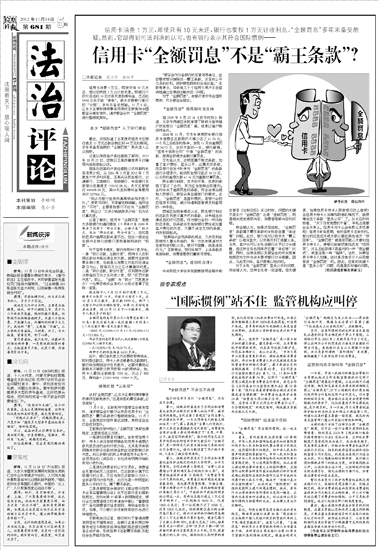 推薦詞:信用卡消費(fèi)1萬(wàn)元,即使只有10元未還,銀行仍然按1萬(wàn)元計(jì)收利息,已還的9990元也要繼續(xù)交納利息和滯納金。這一“行規(guī)”,備受質(zhì)疑,卻難以改變。本報(bào)抓住山東律師請(qǐng)求銀監(jiān)會(huì)整頓這一新聞跟蹤報(bào)道,緊追不舍。同時(shí)采訪法律專家,由多名專家從專業(yè)角度剖析“行規(guī)”違法之所在。先后用兩個(gè)版面,多篇文章給予報(bào)道,形成輿論攻勢(shì)。此后,銀監(jiān)會(huì)就相關(guān)問(wèn)題作出答復(fù),銀行業(yè)對(duì)此進(jìn)行整改。本報(bào)報(bào)道,推動(dòng)了這一“霸王條款”的廢除。 文章被多家網(wǎng)站轉(zhuǎn)載。