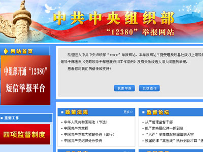 中組部12月正式開通了“12380”短信舉報(bào)平臺(tái),形成了信件、電話、網(wǎng)絡(luò)、短信“四位一體”的“12380”綜合舉報(bào)受理平臺(tái),主要受理反映違規(guī)違紀(jì)選人用人問題的舉報(bào)。