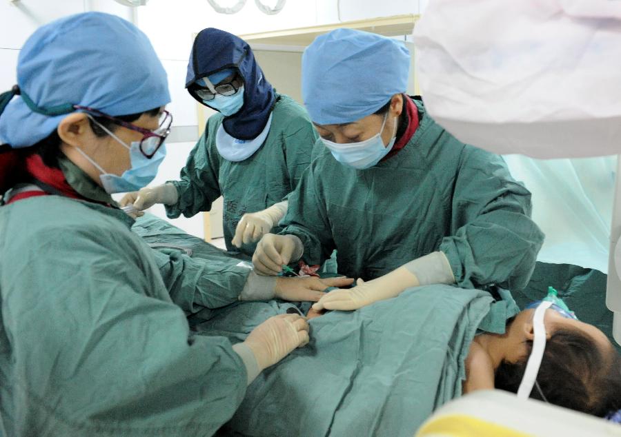 顧虹(右一)在為由她主要籌款捐助的其美拉姆實(shí)施心臟介入手術(shù)(2014年9月23日攝)。新華社記者唐召明攝