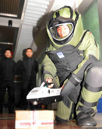 “干擾儀能屏蔽疑似爆炸物的信號,為準(zhǔn)確判斷其類型及炸藥成分,還需使用炸藥探測儀……”一名身穿軍綠色與黑色相間排爆服的特警,在一一做完上述檢查后,趴在地上,右手握著一把特制不導(dǎo)電的剪子,“咔嚓”一聲,剪斷了疑似爆炸物的藍(lán)色電線……