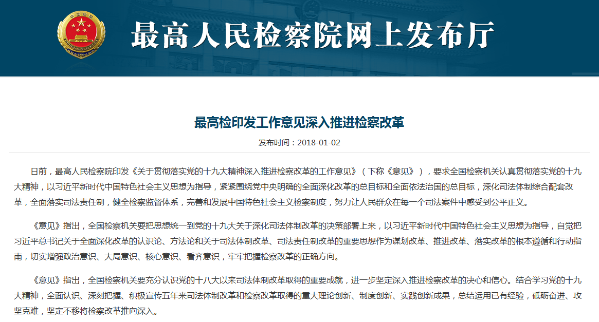 最高人民檢察院印發(fā)《關(guān)于貫徹落實(shí)黨的十九大精神深入推進(jìn)檢察改革的工作意見(jiàn)》,要求全國(guó)檢察機(jī)關(guān)認(rèn)真貫徹落實(shí)黨的十九大精神,以習(xí)近平新時(shí)代中國(guó)特色社會(huì)主義思想為指導(dǎo),緊緊圍繞黨中央明確的全面深化改革的總目標(biāo)和全面依法治國(guó)的總目標(biāo),深化司法體制綜合配套改革,全面落實(shí)司法責(zé)任制,健全檢察監(jiān)督體系,完善和發(fā)展中國(guó)特色社會(huì)主義檢察制度,努力讓人民群眾在每一個(gè)司法案件中感受到公平正義。