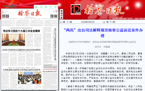 最高人民法院、最高人民檢察院聯(lián)合發(fā)布《關(guān)于檢察公益訴訟案件適用法律若干問題的解釋》!督忉尅饭菜牟糠侄邨l,明確并細化了檢察公益訴訟案件的具體程序,為地方法院、檢察院辦理檢察公益訴訟案件提供了統(tǒng)一的規(guī)范依據(jù)!督忉尅愤M一步明確了檢察公益訴訟任務(wù)與原則,規(guī)定法院、檢察院辦理公益訴訟案件主要任務(wù)是充分發(fā)揮司法審判、法律監(jiān)督職能作用,維護憲法法律權(quán)威,維護社會公平正義,維護國家利益和社會公共利益,督促適格主體依法行使公益訴權(quán),促進依法行政、嚴格執(zhí)法。在辦理公益訴訟案件中,應(yīng)當(dāng)遵守憲法法律規(guī)定,遵循訴訟制度的原則,遵循審判權(quán)、檢察權(quán)運行規(guī)律。