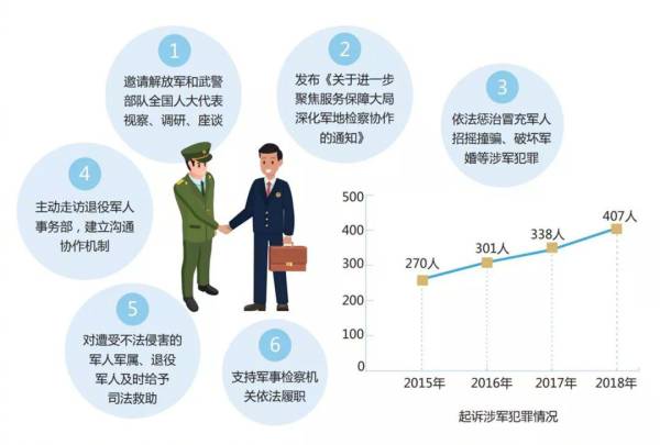 我們堅(jiān)定維護(hù)國(guó)防利益、軍人軍屬合法權(quán)益。加強(qiáng)與解放軍和武警部隊(duì)人大代表聯(lián)系,完善軍地檢察協(xié)作機(jī)制,支持軍事檢察機(jī)關(guān)依法履職,著力服務(wù)軍民融合發(fā)展。起訴涉軍犯罪407人,同比上升20.4%。對(duì)122名遭受不法侵害的軍人軍屬、退役軍人,及時(shí)給予司法救助。主動(dòng)與退役軍人事務(wù)部建起工作機(jī)制,更好維護(hù)退役軍人合法權(quán)益。