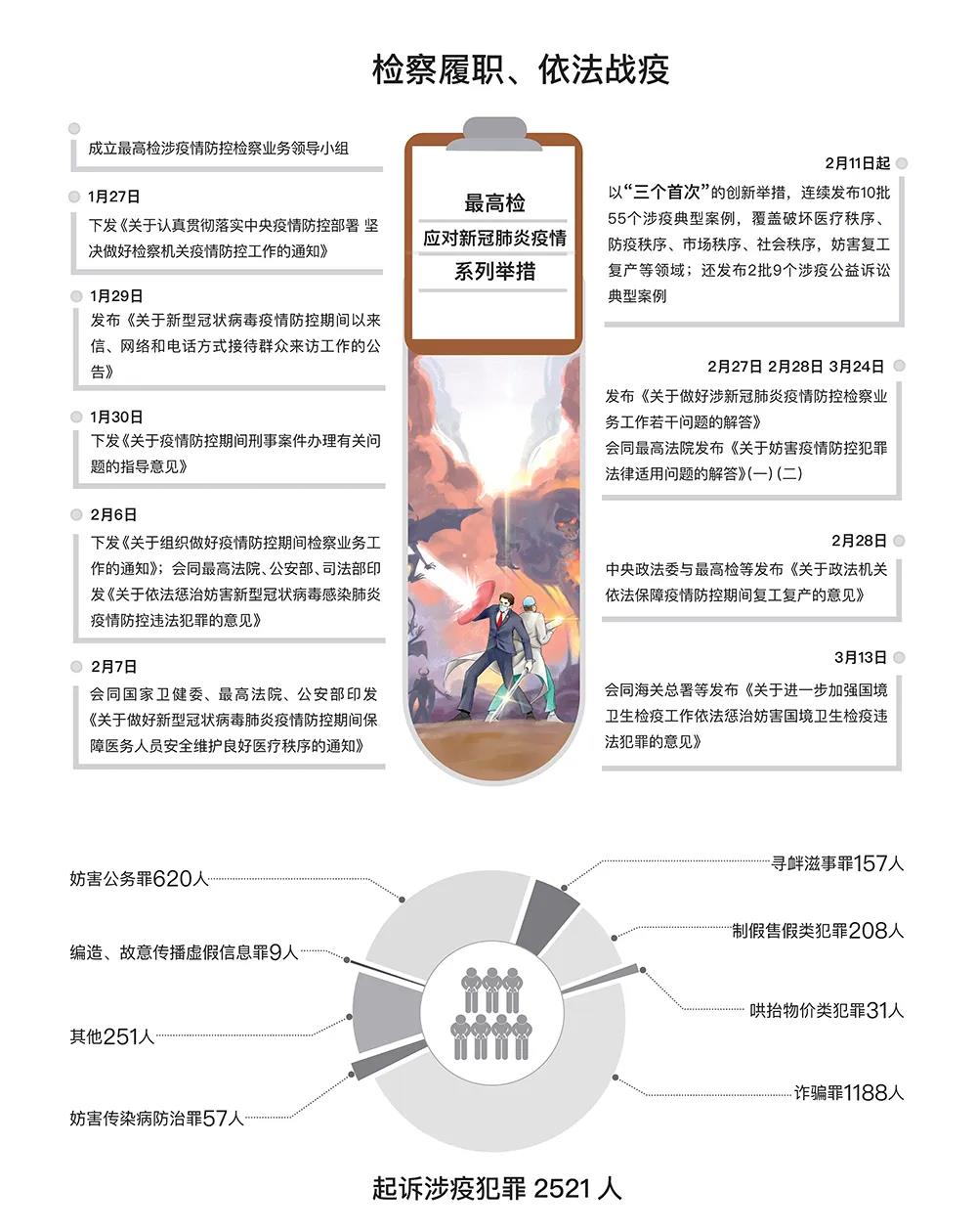 最高人民檢察院堅(jiān)決貫徹習(xí)近平總書記重要指示和黨中央決策部署,帶領(lǐng)各級(jí)檢察機(jī)關(guān)主動(dòng)服務(wù)疫情防控大局,在依法戰(zhàn)疫中守初心、擔(dān)使命。2020年2月至4月,共批準(zhǔn)逮捕涉疫刑事犯罪3751人、起訴2521人,辦理涉口罩等防護(hù)物資監(jiān)管、醫(yī)療廢棄物處置、野生動(dòng)物保護(hù)等領(lǐng)域公益訴訟案件2829件。一是迅速出臺(tái)辦案規(guī)范。疫情突如其來(lái),依法防控更顯重要。為適應(yīng)辦案需要,最高人民檢察院1月30日出臺(tái)專門規(guī)范。其后,會(huì)同相關(guān)政法部門發(fā)布指導(dǎo)意見,依法懲治危害疫情防控犯罪;與國(guó)家衛(wèi)健委等作出部署,對(duì)傷醫(yī)擾醫(yī)犯罪一律從嚴(yán)追訴;與海關(guān)總署等共同規(guī)范懲治妨害國(guó)境衛(wèi)生檢疫犯罪,嚴(yán)防疫情境外輸入性風(fēng)險(xiǎn);與相關(guān)領(lǐng)導(dǎo)機(jī)關(guān)、政法部門共同發(fā)布指導(dǎo)意見,助力復(fù)工復(fù)產(chǎn),促進(jìn)加快恢復(fù)經(jīng)濟(jì)社會(huì)秩序。二是創(chuàng)新以案釋法。應(yīng)對(duì)重大突發(fā)公共衛(wèi)生事件不能按部就班。自2月11日起,最高人民檢察院首次以在辦的批捕起訴案件釋法,首次會(huì)同公安部發(fā)布典型案例,首次以每周一批的頻次,根據(jù)疫情防控不同階段特點(diǎn),分專題發(fā)布10批55個(gè)典型案例,突出維護(hù)醫(yī)療秩序、防疫秩序、市場(chǎng)秩序、社會(huì)秩序,收到規(guī)范司法、警示犯罪、教育社會(huì)的積極效果。三是保障涉案人合法權(quán)益。從一開始就注意準(zhǔn)確把握法律政策,力防突破法律的“從重”“從嚴(yán)”“從快”。犯罪嫌疑人是確診或疑似患者的,首先保障救治,體現(xiàn)司法人文關(guān)懷。對(duì)情節(jié)輕微的涉疫犯罪落實(shí)從寬政策,依法不批捕576人、不起訴117人。在這場(chǎng)嚴(yán)峻斗爭(zhēng)中,各地特別是湖北檢察機(jī)關(guān)聞令而動(dòng),堅(jiān)持自身防疫與依法履職兩手抓,下沉社區(qū)參與一線聯(lián)防聯(lián)控,以法與情寫就中國(guó)抗疫故事檢察篇章。經(jīng)歷這次大考,我們更加深刻感受到中國(guó)共產(chǎn)黨領(lǐng)導(dǎo)和我國(guó)社會(huì)主義制度的顯著優(yōu)勢(shì),更加深刻體會(huì)到法治在國(guó)家治理中的重要作用。