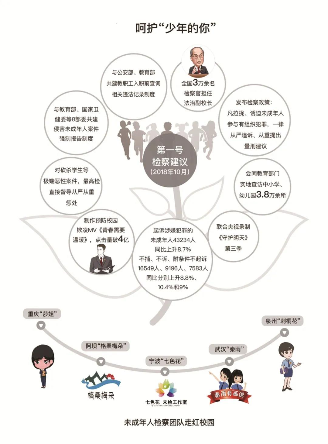 持續(xù)推進(jìn)“一號(hào)檢察建議”落實(shí)。最高人民檢察院2018年就防治校園性侵發(fā)出第一號(hào)檢察建議后,去年又會(huì)同教育部赴8個(gè)省區(qū)市督導(dǎo),與河北、河南、陜西等地省領(lǐng)導(dǎo)夜查寄宿學(xué)校安全管理;地方檢察機(jī)關(guān)與教育部門聯(lián)合查訪中小學(xué)校、幼兒園3.8萬(wàn)余所。推廣上海、湖北、重慶等地經(jīng)驗(yàn),與公安部、教育部共建教職工入職前查詢相關(guān)違法記錄制度;與教育部、國(guó)家衛(wèi)健委等8部委共建未成年人被侵害強(qiáng)制報(bào)告制度,把對(duì)孩子的保護(hù)做得更實(shí)、更細(xì)。起訴侵害未成年人犯罪62948人,同比上升24.1%。專門發(fā)布檢察政策:凡拉攏、誘迫未成年人參與有組織犯罪,一律從嚴(yán)追訴、從重提出量刑建議。依法懲治未成年人犯罪,對(duì)主觀惡性深、犯罪手段殘忍、后果嚴(yán)重的決不縱容;未達(dá)刑事責(zé)任年齡不追訴的,依法送交收容教養(yǎng)或?qū)iT學(xué)校從嚴(yán)矯治。3萬(wàn)余名檢察官擔(dān)任中小學(xué)法治副校長(zhǎng),落實(shí)法治教育從娃娃抓起。