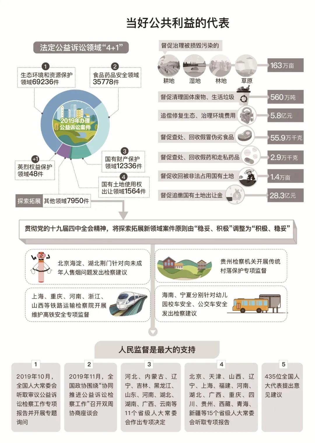 努力做好公益訴訟檢察。牢記檢察官公共利益代表的神圣職責(zé),深化雙贏多贏共贏理念,辦理民事公益訴訟7125件、行政公益訴訟119787件,同比分別上升62.2%和10.1%。堅(jiān)持把訴前實(shí)現(xiàn)維護(hù)公益目的作為最佳司法狀態(tài)。檢察機(jī)關(guān)與政府部門雖分工不同,但服務(wù)人民、追求法治的目標(biāo)一致,公益訴訟并非“零和博弈”。推廣福建、山東等地圓桌會(huì)議和公開送達(dá)機(jī)制,形成整改合力。對(duì)2018年辦理的10萬(wàn)余件訴前檢察建議落實(shí)情況“回頭看”,發(fā)現(xiàn)逾期未回復(fù)、實(shí)際未整改、整改不徹底的8751件,跟進(jìn)督促履職。2019年發(fā)出的103076件訴前檢察建議回復(fù)整改率87.5%,絕大多數(shù)問(wèn)題在訴前得以解決,以最小司法投入獲得最佳社會(huì)效果。黑龍江省人民檢察院專項(xiàng)調(diào)查二次供水安全狀況,向省政府發(fā)出檢察建議后得到高度重視,促進(jìn)了整改落實(shí)。對(duì)發(fā)出公告和檢察建議后公益受損未能解決的,提起公益訴訟4778件,同比上升48%。法院已審結(jié)3238件,支持起訴意見3225件。積極、穩(wěn)妥拓展辦案范圍。對(duì)法律明確賦權(quán)領(lǐng)域之外人民群眾反映強(qiáng)烈的公益損害問(wèn)題,探索立案7950件。北京海淀、湖北荊門等地檢察機(jī)關(guān)針對(duì)校園周邊商戶向孩子售煙問(wèn)題發(fā)出檢察建議,督促職能部門履職;國(guó)家衛(wèi)健委等8部委主動(dòng)深化青少年控?zé)煵渴。公益訴訟檢察工作得到各級(jí)人大重視支持。全國(guó)人大常委會(huì)聽取審議專項(xiàng)報(bào)告并進(jìn)行專題詢問(wèn),435位全國(guó)人大代表提出意見建議;15個(gè)省級(jí)人大常委會(huì)聽取專項(xiàng)報(bào)告,11個(gè)省級(jí)人大常委會(huì)作出專項(xiàng)決定,給予有力監(jiān)督支持。