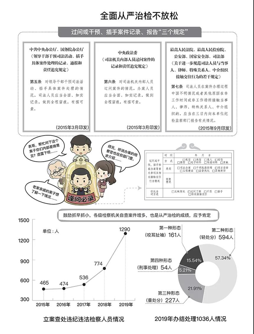 堅(jiān)持全面從嚴(yán)治檢。過(guò)問(wèn)或干預(yù)、插手司法辦案等重大事項(xiàng)須記錄報(bào)告,中央和有關(guān)部門早有“三個(gè)規(guī)定”!斑^(guò)問(wèn)”主要是陳述情況、了解進(jìn)展,多為監(jiān)督公正司法;“記錄、報(bào)告”有利約束檢察官,防止人情案、關(guān)系案、金錢案。面對(duì)多數(shù)不實(shí)的“零報(bào)告”,最高人民檢察院以上率下,要求“逢問(wèn)必錄”,不讓“零報(bào)告”架空好規(guī)定。四級(jí)檢察院全員覆蓋、逐月報(bào)告,共記錄報(bào)告2018年以來(lái)有關(guān)事項(xiàng)18751件。自覺(jué)接受各級(jí)紀(jì)委監(jiān)委及派駐紀(jì)檢監(jiān)察組監(jiān)督,以刮骨療毒的勇氣減存量、遏增量,包括最高人民檢察院機(jī)關(guān)和事業(yè)單位6人在內(nèi)的1290名檢察人員因違紀(jì)違法被立案查處,同比上升66.7%,54人被追究刑事責(zé)任。堅(jiān)持刀刃向內(nèi),從嚴(yán)查處為黑惡勢(shì)力站臺(tái)撐腰的檢察人員42人。堅(jiān)持實(shí)事求是,對(duì)嚴(yán)抓嚴(yán)管查處更多案件的給予肯定,鼓勵(lì)抓早抓小,把管黨治黨主體責(zé)任落實(shí)。