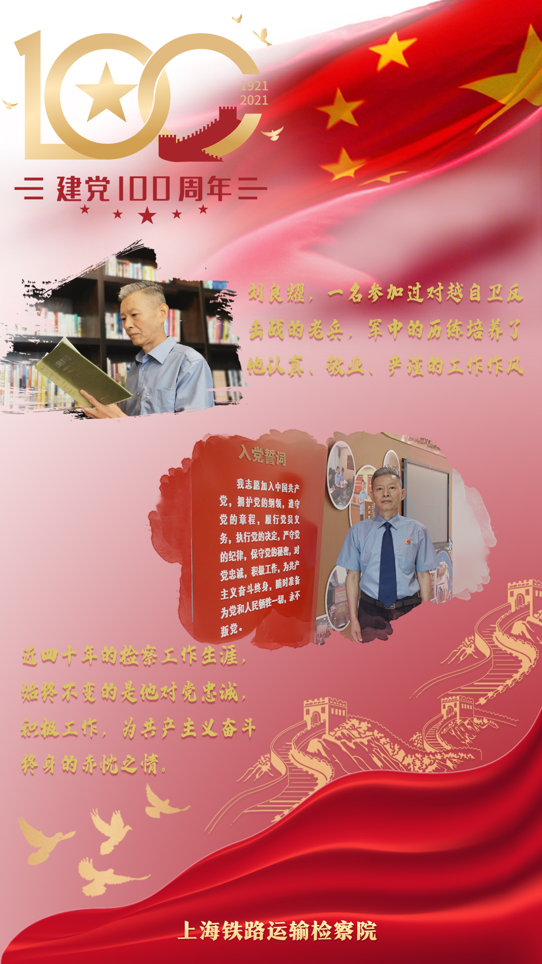 劉良耀,經(jīng)受過戰(zhàn)場洗禮的老兵,也是上海鐵路運輸檢察院第一位軍轉(zhuǎn)干部。參加過對越自衛(wèi)反擊戰(zhàn)的他,在部隊培養(yǎng)了認真、敬業(yè)、嚴謹?shù)墓ぷ髯黠L。先后在上海鐵路運輸檢察院辦公室、政治部、紀檢監(jiān)察工作,近四十年的檢察工作生涯,始終不變的是他對黨忠誠,積極工作,為共產(chǎn)主義奮斗終身的赤忱之情。不忘初心、牢記使命,讓我們用實實在在的工作為黨旗添光彩!