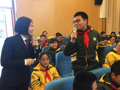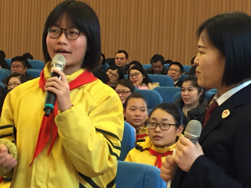 “青少年面對(duì)成長道路中可能存在的不良影響,如何知法懂法守法,選擇正確的道路和方向…”檢察微電影《人生路口》中的娓娓講述,如同一道可口的餐前甜點(diǎn),一下就抓住了孩子們的心。接著,由最高檢從全國擇選出的兩名優(yōu)秀檢察官,又以新穎生動(dòng)的課件、豐富充實(shí)的故事、親切幽默的語言,為孩子們“精調(diào)細(xì)做”了《莫讓網(wǎng)事不堪回首》、《電影中的普法劇》兩道大菜。面對(duì)料鮮而味足的“美餐”,孩子們不僅“嘗”得津津有味,甚至“擼起袖子”踴躍互動(dòng),參與到“烹制美餐”的行列,現(xiàn)場(chǎng)氣氛十分火爆。