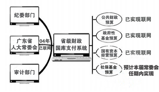 2004年,廣東省人大財(cái)經(jīng)委實(shí)現(xiàn)了與省財(cái)政廳國(guó)庫(kù)集中支付系統(tǒng)聯(lián)網(wǎng),廣東在全國(guó)率先實(shí)現(xiàn)省級(jí)公共財(cái)政預(yù)算支出聯(lián)網(wǎng)監(jiān)督。2010年,省級(jí)和21個(gè)地級(jí)以上市全部實(shí)現(xiàn)了人大財(cái)經(jīng)委與財(cái)政部門、審計(jì)部門的聯(lián)網(wǎng),此外,廣東省人大常委會(huì)不斷拓展預(yù)算聯(lián)網(wǎng)監(jiān)督覆蓋面,推進(jìn)監(jiān)督從公共財(cái)政預(yù)算資金、政府性基金預(yù)算資金擴(kuò)大到國(guó)有資本經(jīng)營(yíng)預(yù)算資金和社;痤A(yù)算資金。