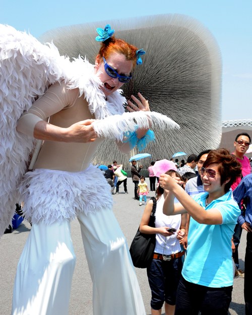 5月31日,世博園英國館的小丑演員與游客互動(dòng)。