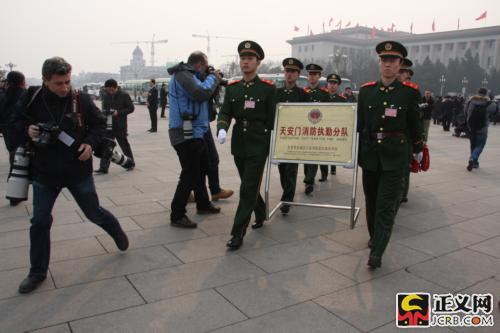 天安門消防執(zhí)勤分隊(duì)的戰(zhàn)士們走進(jìn)天安門廣場(chǎng)馬上吸引了外國(guó)記者的目光 本網(wǎng)記者孟澍菲攝