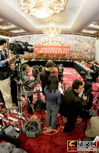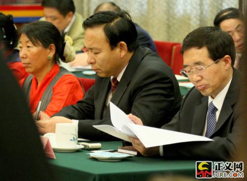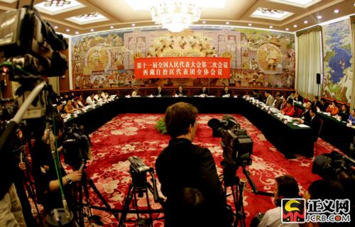3月6日下午,人民大會堂西藏廳,西藏代表團在審議溫家寶總理代表國務院作的政府工作報告,百余名中外記者齊聚西藏代表團會場。記者從西藏代表團荻悉:目前,西藏社會穩(wěn)定,經濟發(fā)展,人民安居樂業(yè),生活富足…… 傅偉攝