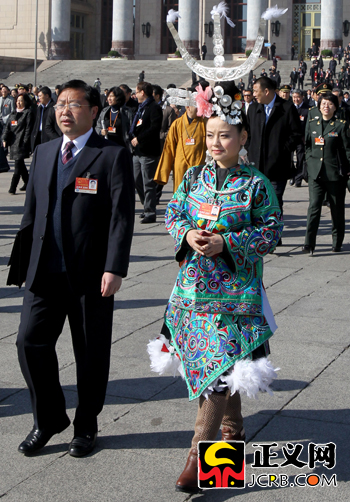3月4日上午,十一屆全國(guó)人大四次會(huì)議召開預(yù)備會(huì)。貴州代表雷阿幼朵身著民族服裝走出會(huì)場(chǎng)。傅偉/攝