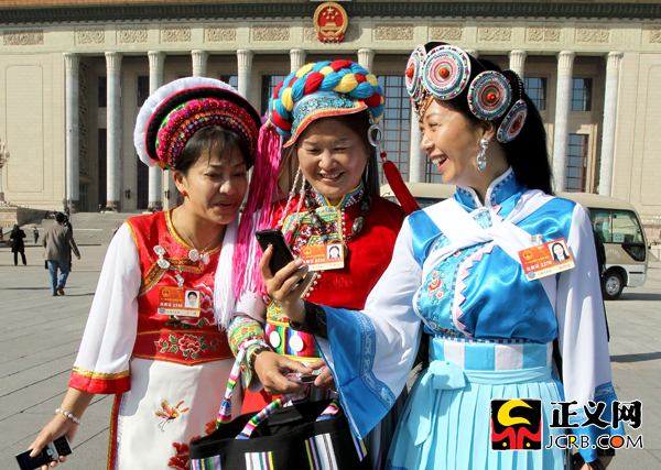 3月4日上午,十一屆全國(guó)人大四次會(huì)議召開預(yù)備會(huì)。三位少數(shù)民族代表在人民大會(huì)堂前欣賞用手機(jī)拍攝的留影照。傅偉/攝