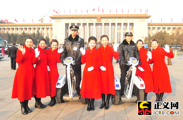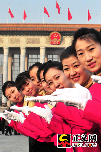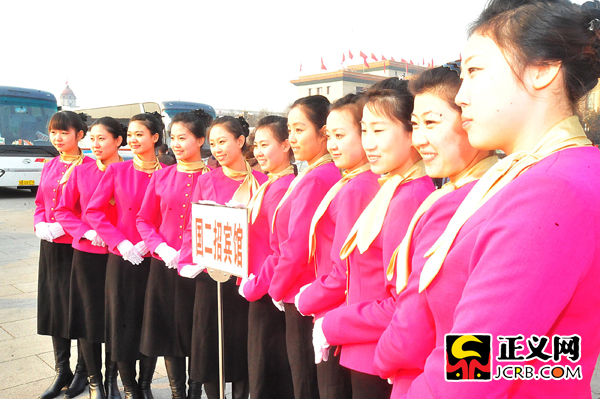 代表駐地的禮儀小姐為兩會(huì)增色添彩。靚麗的衣服和燦爛的笑容,使她們成為大會(huì)堂前一道靚麗的風(fēng)景線。程丁/攝