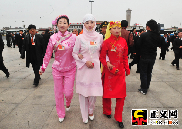 3月14日上午,第十一屆全國人民代表大會第四次會議在北京人民大會堂舉行閉幕會。會議批準(zhǔn)了政府工作報告、“十二五”規(guī)劃綱要、全國人大常委會工作報告及“兩高”工作報告。圖為甘肅團(tuán)代表步入會場。程丁/攝