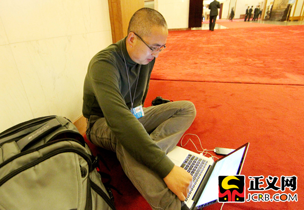 3月11日,十一屆全國(guó)人大四次會(huì)議舉行第三次全體會(huì)議,最高人民檢察院檢察長(zhǎng)曹建明作最高人民檢察院工作報(bào)告。場(chǎng)外,一名記者在發(fā)稿。傅偉/攝