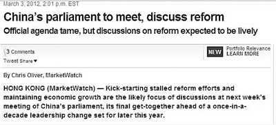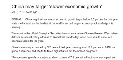 記者在谷歌新聞頁面上搜索兩會新聞,有數(shù)萬個相關(guān)結(jié)果,梳理其中的最新新聞發(fā)現(xiàn),外媒探討的重點有兩個:一是關(guān)注中國改革,二是關(guān)注2012年中國調(diào)低經(jīng)濟(jì)增長速度。