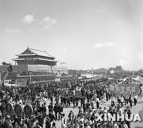資料圖片:這是1956年5月1日,北京舉行群眾游行,慶!拔逡弧眹H勞動節(jié)。
