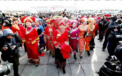 少數(shù)民族代表身著民族服裝步入會場。我國現(xiàn)行選舉法規(guī)定,人口特別少的民族至少應(yīng)有一名代表。國務(wù)院新聞辦去年9月27日發(fā)表的《中國的民族政策與各民族共同繁榮發(fā)展》白皮書顯示,我國歷屆全國人民代表大會中,少數(shù)民族代表人數(shù)占全國人民代表大會代表總?cè)藬?shù)的比例,均高于同期少數(shù)民族人口占全國總?cè)丝诘谋壤?/p>