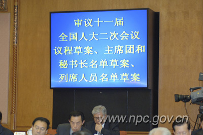 2月25日下午,十一屆全國人大常委會第七次會議舉行第一次全體會議,審議十一屆全國人大二次會議議程草案、主席團(tuán)和秘書長名單草案、列席人員名單草案。中國人大網(wǎng) 王新慶攝