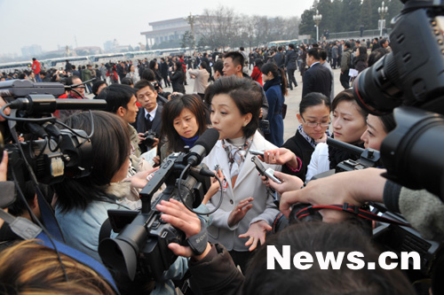 2009年3月3日,中國(guó)人民政治協(xié)商會(huì)議第十一屆全國(guó)委員會(huì)第二次會(huì)議在北京人民大會(huì)堂開(kāi)幕。圖為全國(guó)政協(xié)委員楊瀾接受媒體采訪。新華社記者溫桂旭 攝